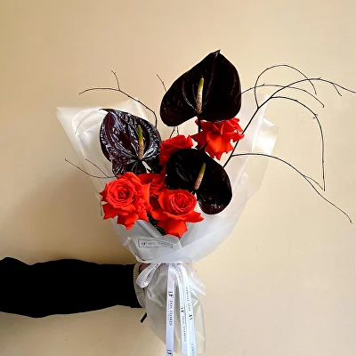 Летний букет с пионами, с гортензией и экзотическим антуриумом. Ширина букета ~ 45 см