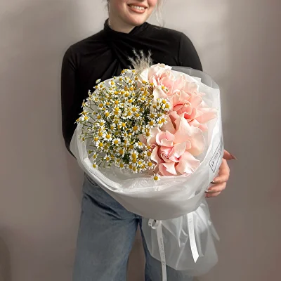 Небольшой милый букет из гортензии, ромашек и белых диантусов для любого повода.